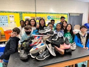 Photo caption: In the North Babylon School District, the Robert Moses Middle School Environmental-Recycling Club members spearheaded a project to recycle used sneakers. The club oversaw promoting the project, collecting the sneakers from the classes, counting the sneakers, and boxing up the sneakers to be given to Nike. Nike then grinds the sneakers down and turns them into different surfaces such as tracks, playgrounds, tennis courts and much more. The project at Robert Moses collected nearly 100 sneakers that would have otherwise gone into landfills. Since 1990, Nike’s program has collected more than 28 million shoes for recycling. In addition, Nike has placed Reuse-A-Shoe bins in all its U.S. retail stores including the Deer Park Tanger Outlet store.