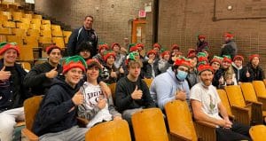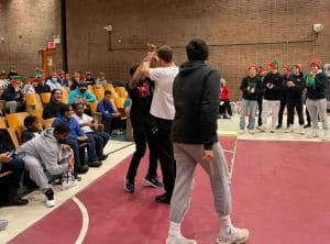 Before the holidays, Coach Tortora brought his varsity Greeley wrestling team to P10X in the South Bronx, where he teaches, for students to spend time together and gain valuable insight about their advantages in life. The students talked, practiced wrestling, and shared pizza and desserts. Each P10X student was given a holiday gift. This field trip in mid-December has become “one of Greeley Wrestling’s best traditions,” said senior Ben Gottlieb.