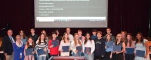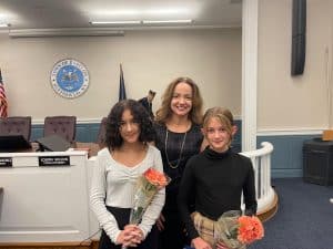 Photo caption: Two sixth grade students from West Babylon Junior High School were named winners in the Town of Babylon’s Veterans’ Awareness Week Essay contest. Angela Rosenberger won first place and Sienna Cruz was named a third-place winner. Both students felt that it was important to write the essay about their appreciation for the veterans of this country. Rosenberger decided to take her prize money and purchase turkeys for families in need for Thanksgiving. They are pictured with their teacher Mrs. Brower-Cohen.