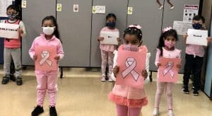 Photo caption: October is Breast Cancer Awareness Month. The students in Dr. Pino’s kindergarten class at Susan E. Wiley Elementary School in the Copiague School District are wearing pink to show their support for those affected by breast cancer. Students and staff at Susan E. Wiley stand together but six feet apart.