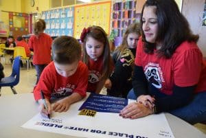 After discussing the meaning behind Veterans Day and how important it is to give thanks to all who protect the country, the students fashioned colorful and creative paper place mats decorated with traditional thanksgiving ideas. After the creations were laminated, they were delivered to the Long Island State Veterans Home in Stony Brook just before the Thanksgiving holiday.