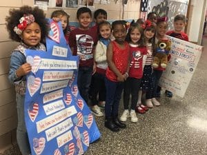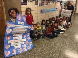 Continuing an annual patriotic tradition for Veterans Day, teacher Tammy Cotrone and her kindergarten class at Deer Park’s May Moore Primary School created a special tribute to local veterans and delivered it to them at Town Hall. Students’ military family photos are also displayed outside their classroom.