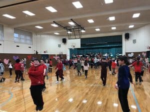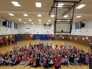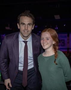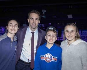 Photo caption: Westhampton Beach Middle School eighth-graders (from left) Reilly Mahon, Anthony Agudelo and Lauren Goss were honored by the New York Islanders for teaming up to raise money for East End Disability Associates through a polar bear plunge that they organized in January. The students were invited to attend the Islanders’ March 1 game, where they were recognized with the Ladd’s Leaders award after being nominated through the Team Up 4 Community organization. The students are pictured with Islanders player Andrew Ladd.