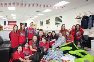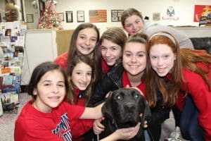 Photo caption: The cheerleading squad from Nesaquake Middle School in the Smithtown Central School District, along with their coach Amber Murphy, visited the Paws of War of Nesconset on Dec. 11 to drop off food, beds and other supplies they have been collecting for the service animals and their veteran owners. Paws of War trains shelter dogs to be service animals for local veterans who have returned home. While there, the cheerleaders watched a training session, met some of the dogs in training, and watched a veteran take home her service dog for the first time.