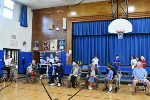 Ahead of their assembly, Blue Point Elementary students created a moving “Hallway of Heroes” tribute decorated with stars bearing photos and facts about Bayport-Blue Point veterans. Additionally, students participated in fundraising efforts to support Cooking for Long Island Veterans, an organization dedicated to providing meals and groceries to homebound veterans.