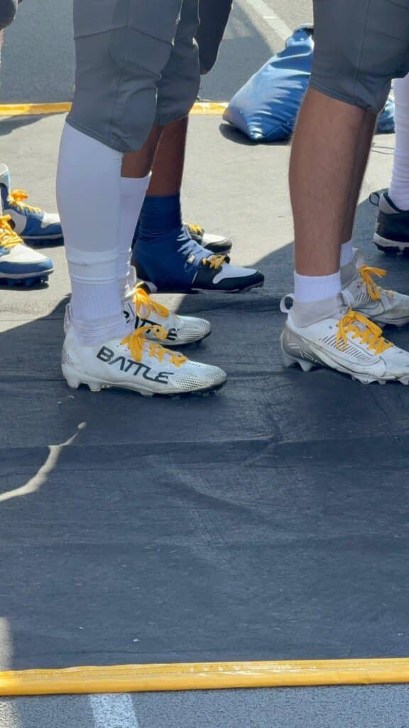 B: The Eastport-South Manor Sharks football players wore gold laces during a “gold-out” with East Hampton to raise money for the Bentley Foundation.