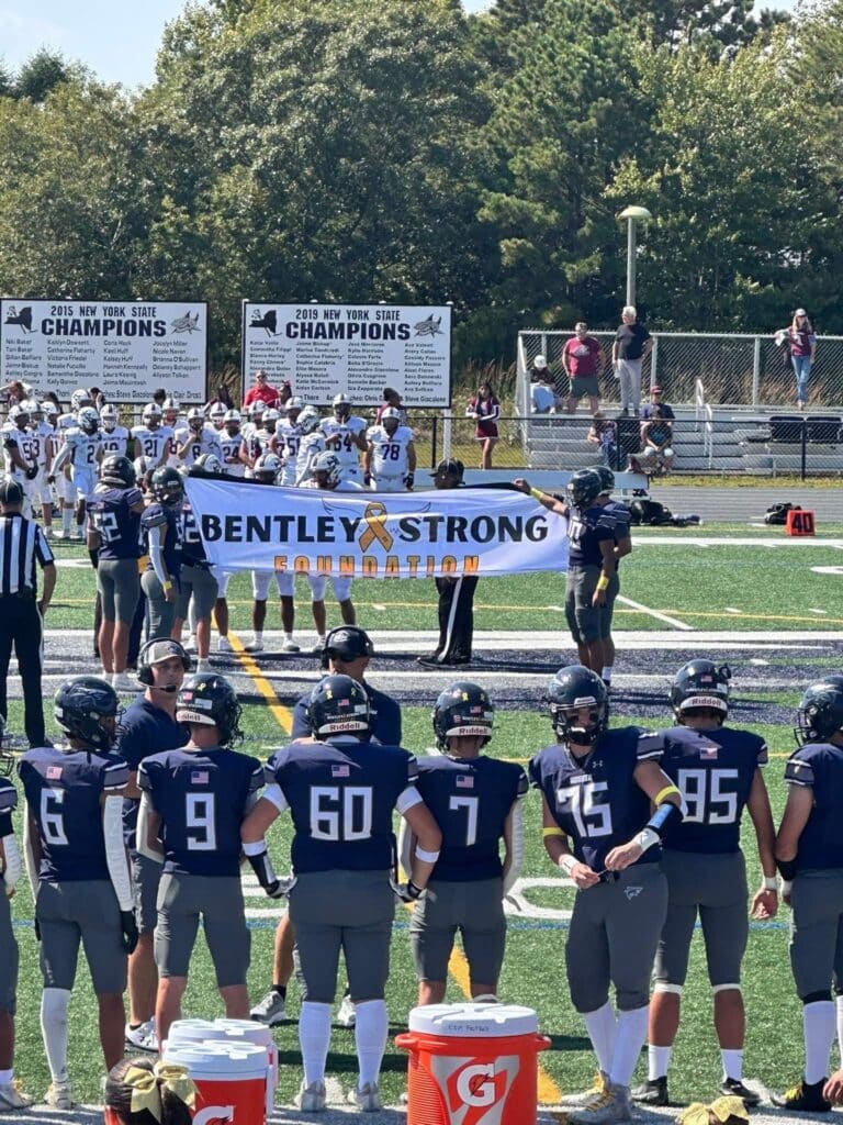 C: The Eastport-South Manor Sharks football team held a season opener with East Hampton that raised $800 for the Bentley Foundation’s awareness for childhood cancer.