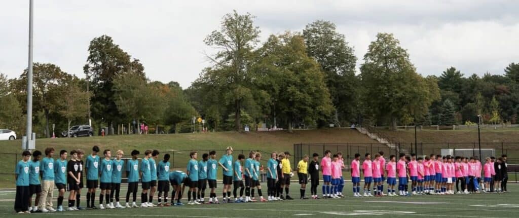 Broad community enthusiasm for Kicks for Cancer was visible as soon as the school year launched in Concord and Carlisle. Well before game day, pink and teal lawn signs dotted yards across Concord, Carlisle, and neighboring towns including Sudbury, Lincoln, and Bedford. The Friday before the event, schools were awash in pink for Pink Day, with students, faculty, and staff proudly donning the iconic pink Kicks for Cancer jerseys. Local businesses also rallied around the cause, hosting events and fundraisers to amplify the message of “One Community, One Goal.”