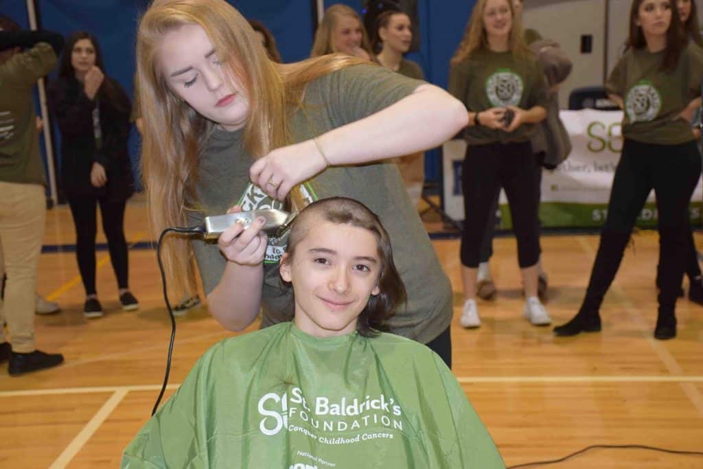 Coordinated by social studies teacher Erica Alemaghides, professional bagpipers and an Irish step dancer encouraged the cheers from the crowd as the 18 brave students and staff members took their seats in the barber’s chairs to have their heads shaved by Rocky Point High School cosmetology students.