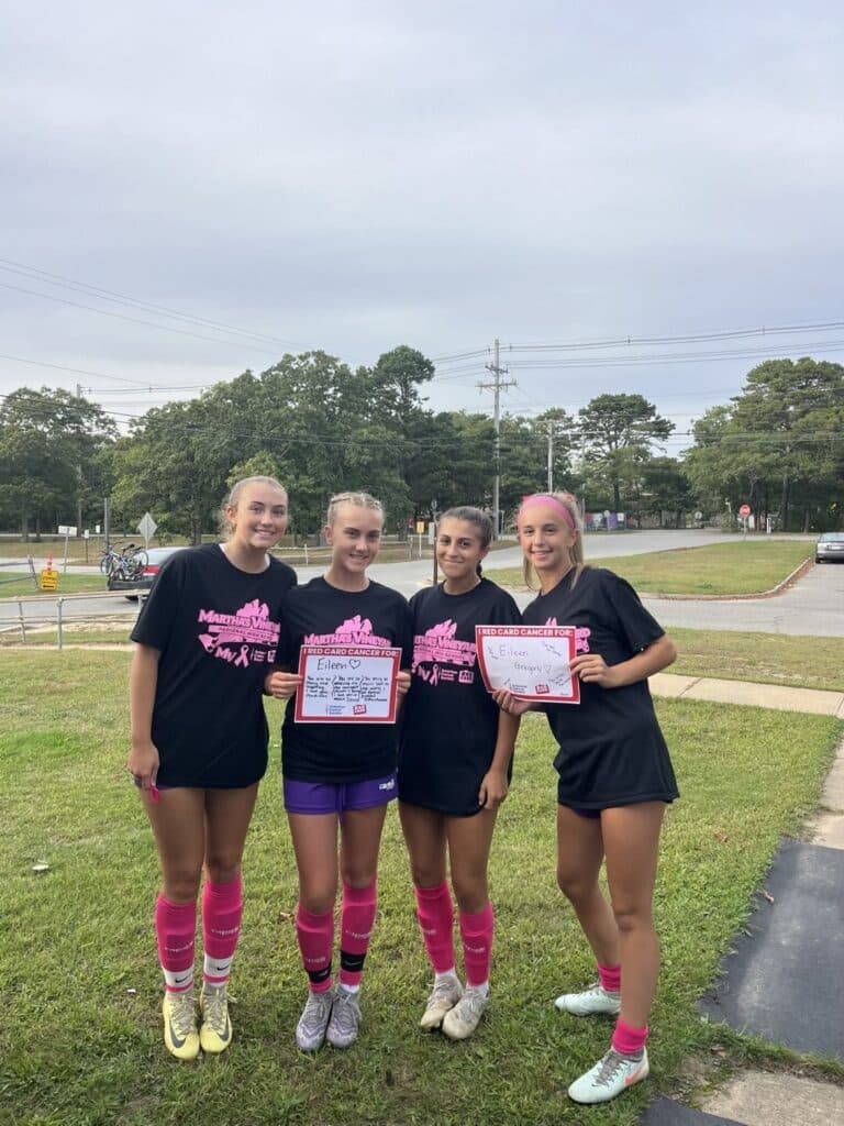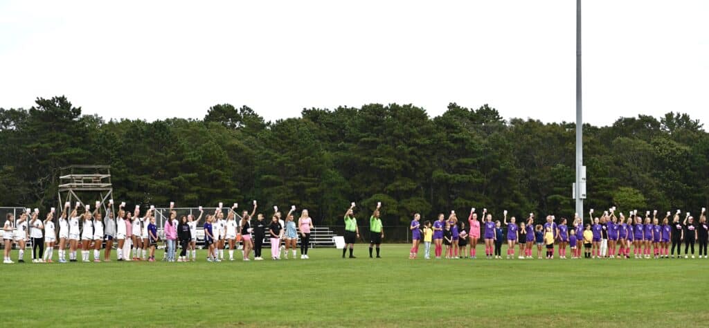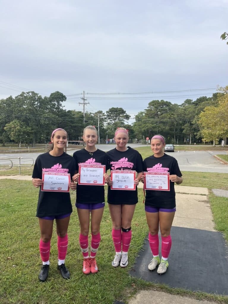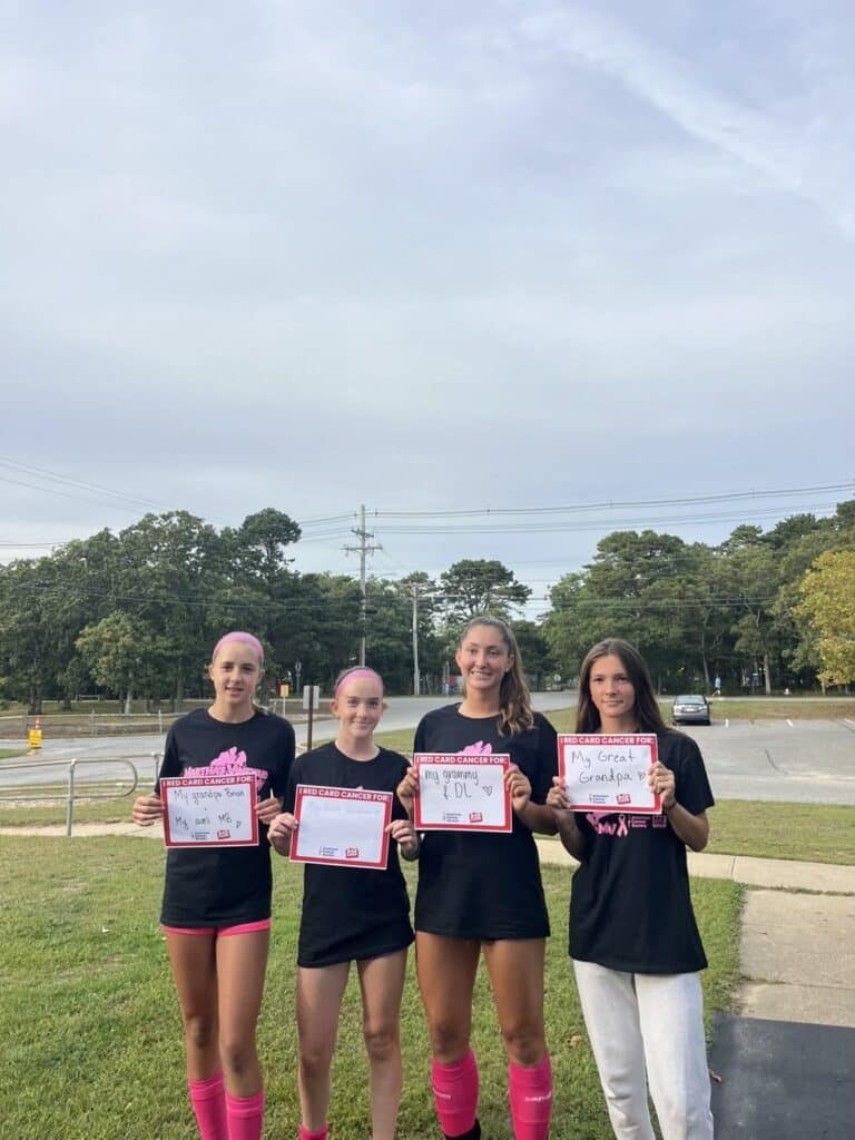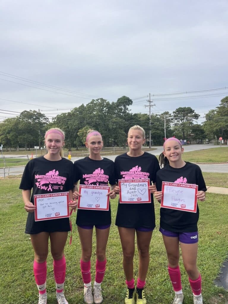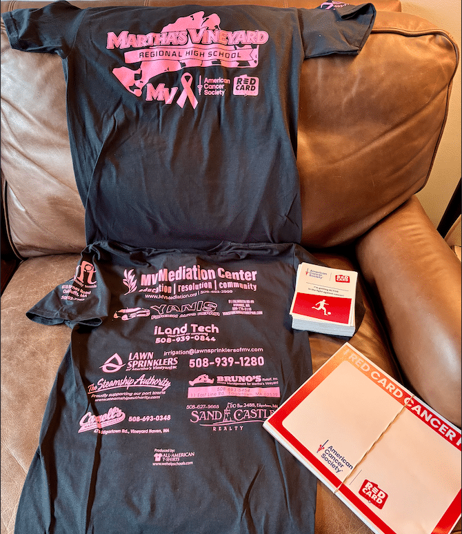 Martha’s Vineyard Regional HS soccer programs, both boys and girls soccer, hosted the American Cancer Society’s Red Card Cancer Event on Sep 26th and 27th for their night games. Vineyard boys played against Falmouth HS, while the lady Vineyarders hosted non-league Archbishop Williams on Saturday night. We have always had a cancer awareness game in past seasons, but with so many affected by cancer, especially in our close-knit island community, we wanted to do something a bit more special than just wearing pink socks and ribbons. Our boys and girls soccer teams had back-to-back night games Friday and Saturday this season so we used those two home games to schedule our cancer awareness games. The players got all the fans and student section to wear Pink for the game, “Pink Out”. We partnered with All American Publishing, who generated local advertising through our local businesses to produce 200 FREE t-shirts for this event. The t-shirts, which highlighted the American Cancer Society’s logos, designed in black and pink, were a huge success. The players and coaches got a commemorative shirt, and all the female players got pink ribbons for their hair. Over 100 fans got t-shirts and held up ceremonial red cards to make a statement about supporting cancer research and patient services.