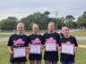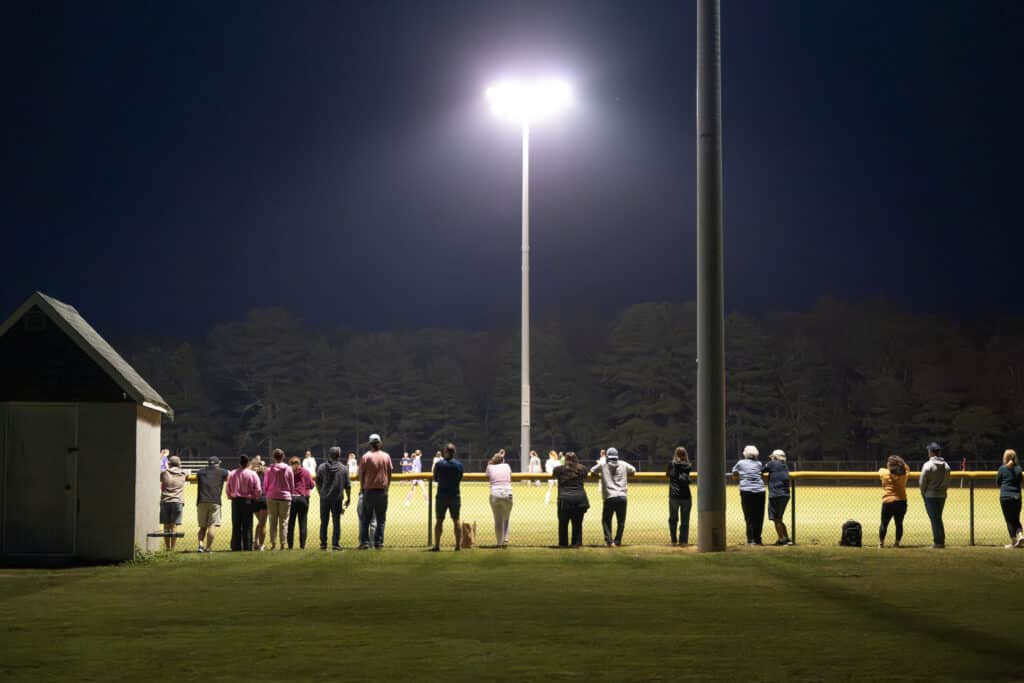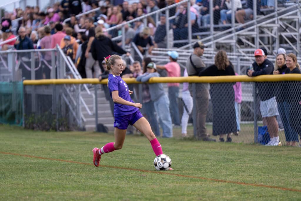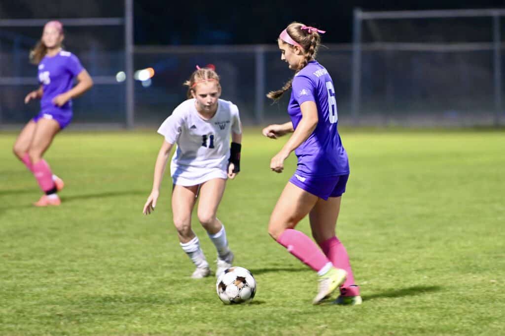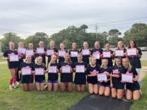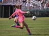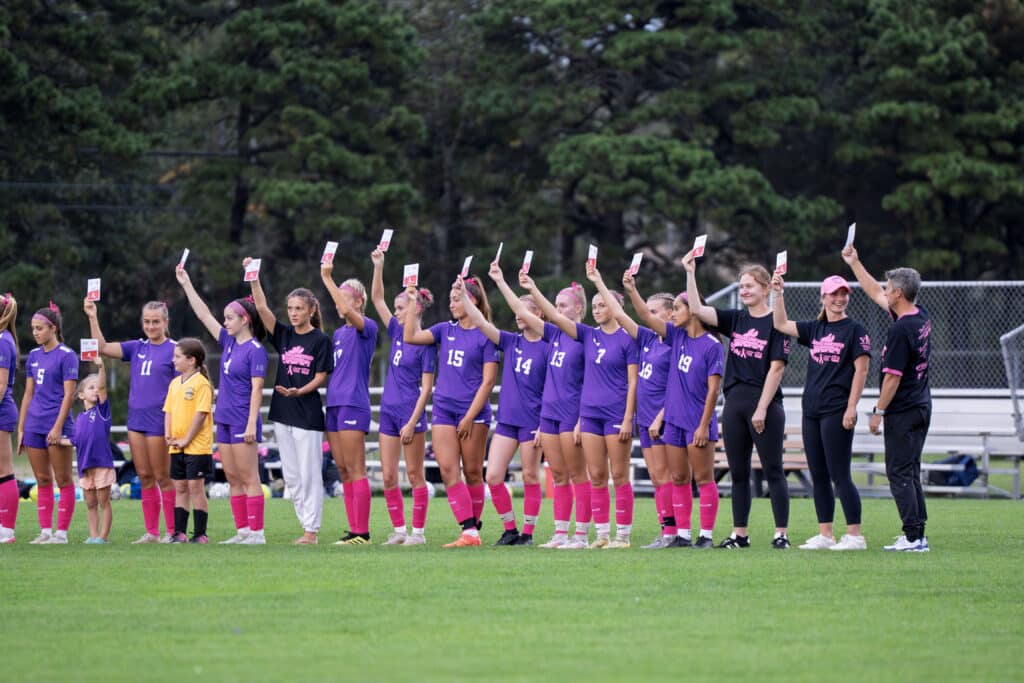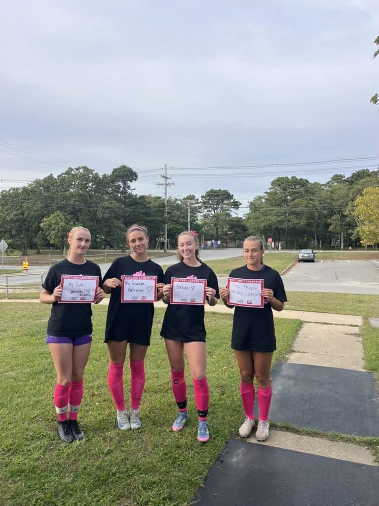 Martha’s Vineyard Regional HS soccer programs, both boys and girls soccer, hosted the American Cancer Society’s Red Card Cancer Event on Sep 26th and 27th for their night games. Vineyard boys played against Falmouth HS, while the lady Vineyarders hosted non-league Archbishop Williams on Saturday night. We have always had a cancer awareness game in past seasons, but with so many affected by cancer, especially in our close-knit island community, we wanted to do something a bit more special than just wearing pink socks and ribbons. Our boys and girls soccer teams had back-to-back night games Friday and Saturday this season so we used those two home games to schedule our cancer awareness games. The players got all the fans and student section to wear Pink for the game, “Pink Out”. We partnered with All American Publishing, who generated local advertising through our local businesses to produce 200 FREE t-shirts for this event. The t-shirts, which highlighted the American Cancer Society’s logos, designed in black and pink, were a huge success. The players and coaches got a commemorative shirt, and all the female players got pink ribbons for their hair. Over 100 fans got t-shirts and held up ceremonial red cards to make a statement about supporting cancer research and patient services.