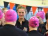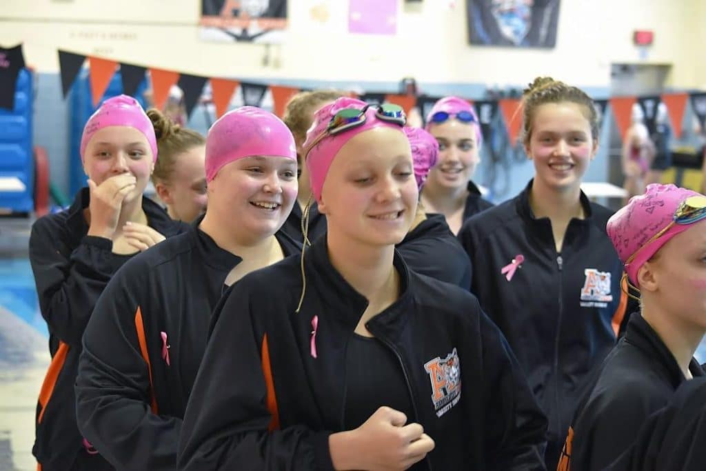 At the beginning of the season, we pick one home swim meet that we designate as our “Pink the Pool” meet. Usually towards the end of the season and in October to coincide with Breast Cancer awareness month. The girls were all given pink swim caps donated by Ad-Pro sports via ECMC. They took the caps to school and got them signed by teachers, classmates, friends, family for a $1 donation. They were given about 3 weeks to accomplish this.