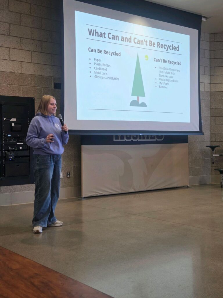 This winter, student volunteers partnered with Anoka County Resource Solutions to improve the school’s recycling program. After receiving a $1,549 grant from the county, recycling bins were placed alongside trash bins in every classroom, locker area, and entryway, along with clear signage to help educate students and staff about proper recycling. To educate staff and students, Leo members presented at a staff meeting, communicated with teachers about the project’s goals, created and shared a recycling awareness video, hosted a Kahoot trivia game during lunches, and organized a Sustainability Week with daily themes.