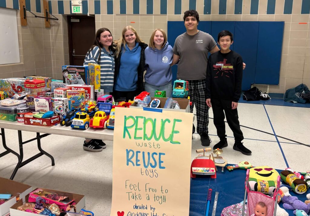 This past fall, the Andover Leo Club leadership team came together to establish their yearly service project theme. After discussing questions such as “What issues matter most to you?”, “How would you like the world to be different?”, and “What are the biggest challenges in our school?”, the team landed on sustainability. After researching the issue and exploring the root causes of environment problems, they created committees to focus on specific projects, including improving Andover’s recycling program, increasing recycling education for the student body, building middle school and elementary partnerships, holding a Sustainability Week, and leading a Reduce, Reuse, Recycle Toy Drive.