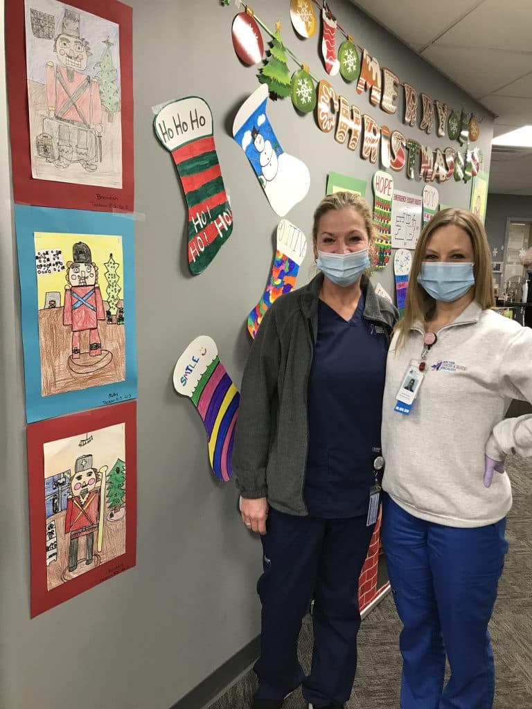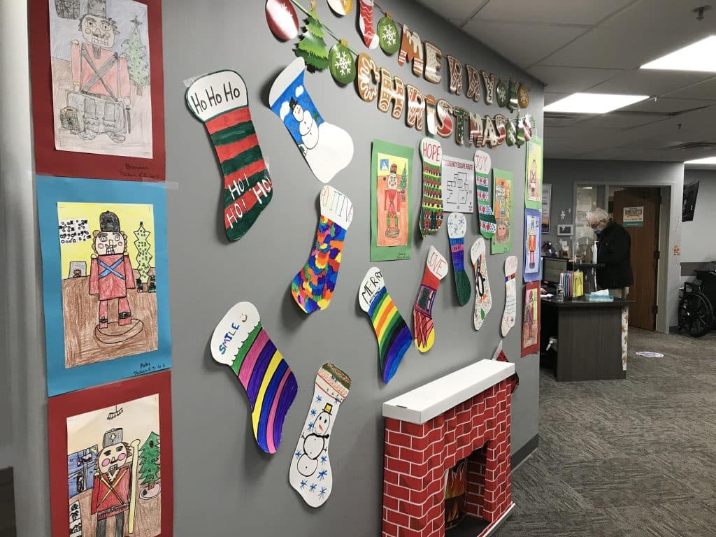 Photo caption: Student-artists at Tackan Elementary School in the Smithtown Central School District have been hard at work creating a variety of holiday projects not only to bring holiday cheer to the halls of their school but also to the Infusion Center at New York Cancer and Blood Center in Smithtown. Students created stockings and drawings that were recently delivered to the center. Nurses and patients spend hours in the decorated space and the bright, festive projects are bringing joy and cheer to them this holiday season.