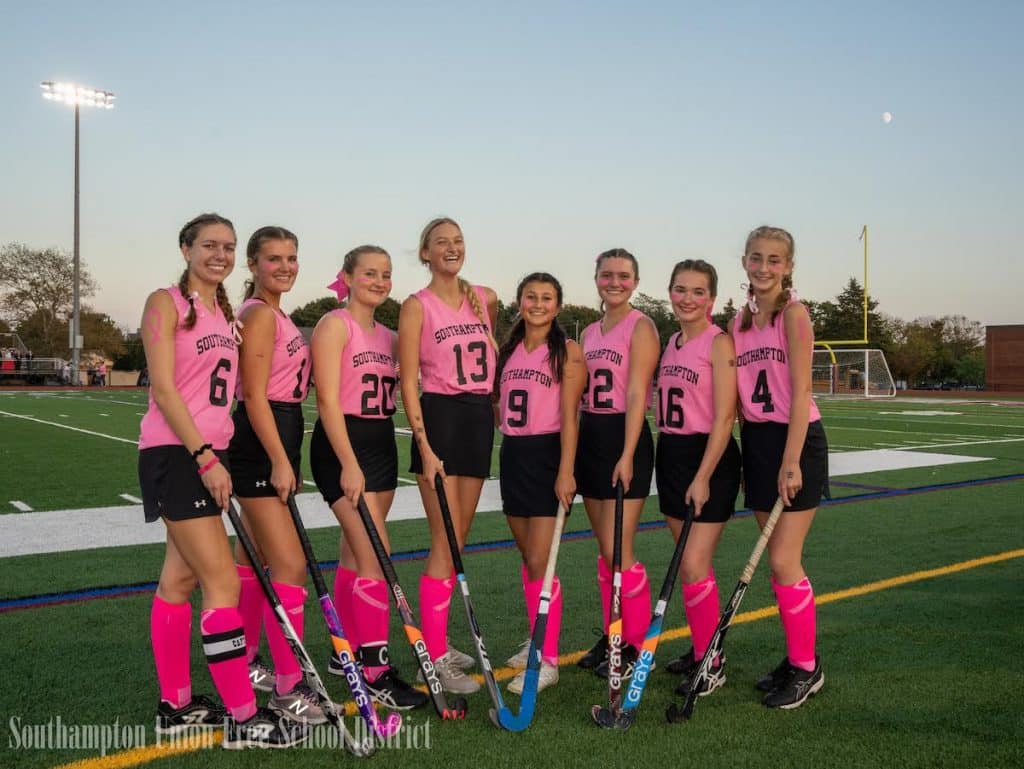 Through various fundraising efforts, the Southampton Field Hockey Team raised over $5,400 for the Coalition for Women’s Cancers at Stony Brook Southampton Hospital. The fundraising efforts were part of their yearly “pink game”, where the team wears pink jerseys and raises money to help fight breast cancer. The field hockey team hosted a car wash, had a lemonade stand, sold t-shirts and collected donations at the Southampton high school games during homecoming week.