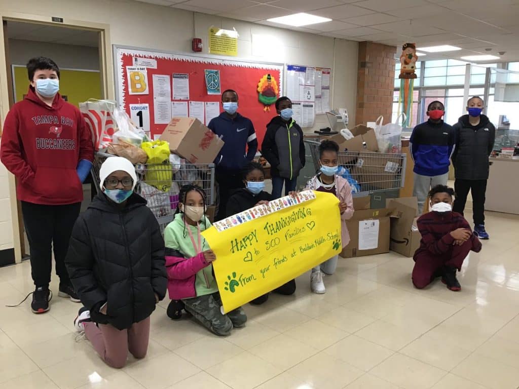 For this year’s Thanksgiving, the sixth grade English Language Arts (ELA) classes led their peers in a Community Service Project inspired by the historical fiction novel they recently finished reading, Bud, Not Buddy. The Newbery Medal and Coretta Scott King Award-winning classic about a 10-year-old orphan living in foster care during the Great Depression resonated with the students. Recognizing the hardships triggered by the pandemic, the six graders decided to focus on helping Long Island foster care families in need by donating non-perishable food items and supermarket gift cards. Baldwin Middle School students collected five boxes and a dozen bags worth of goods, which were then sent to SCO Family of Services, a not-for-profit dedicated to finding safe homes and caring families for children who have been placed in the foster care system. The donations will help give the foster care children and their families the warm and plentiful Thanksgiving feast they deserve.