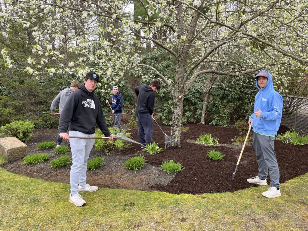 During the cleanup, six players volunteered, with most having already fulfilled their community service requirement for graduation but choosing to volunteer nonetheless. They spent 1.5 hours cleaning out mulch beds, spreading new mulch, and transplanting plants.