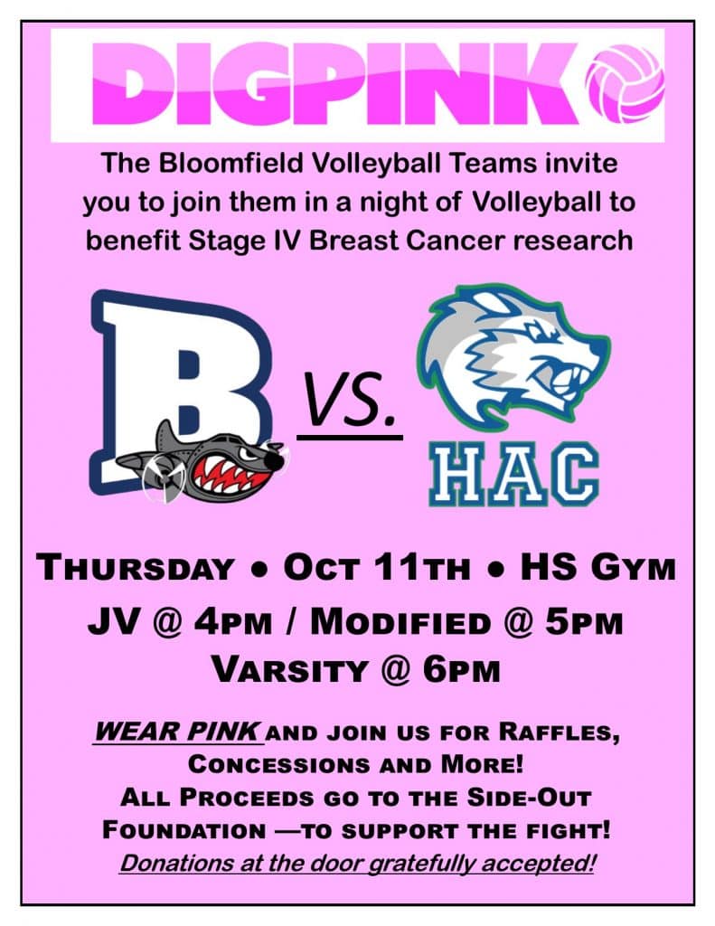 We hope that on October 11th you will join the Bloomfield Bombers during their Dig Pink! fundraising event. Each volleyball player has worked hard to make this evening one of fun competition while also bringing awareness to The Side-Out Protocol to fund targeted therapy clinical trials in combatting Stage IV Breast Cancer. You will find the details of the event and contact information below. Thank you!