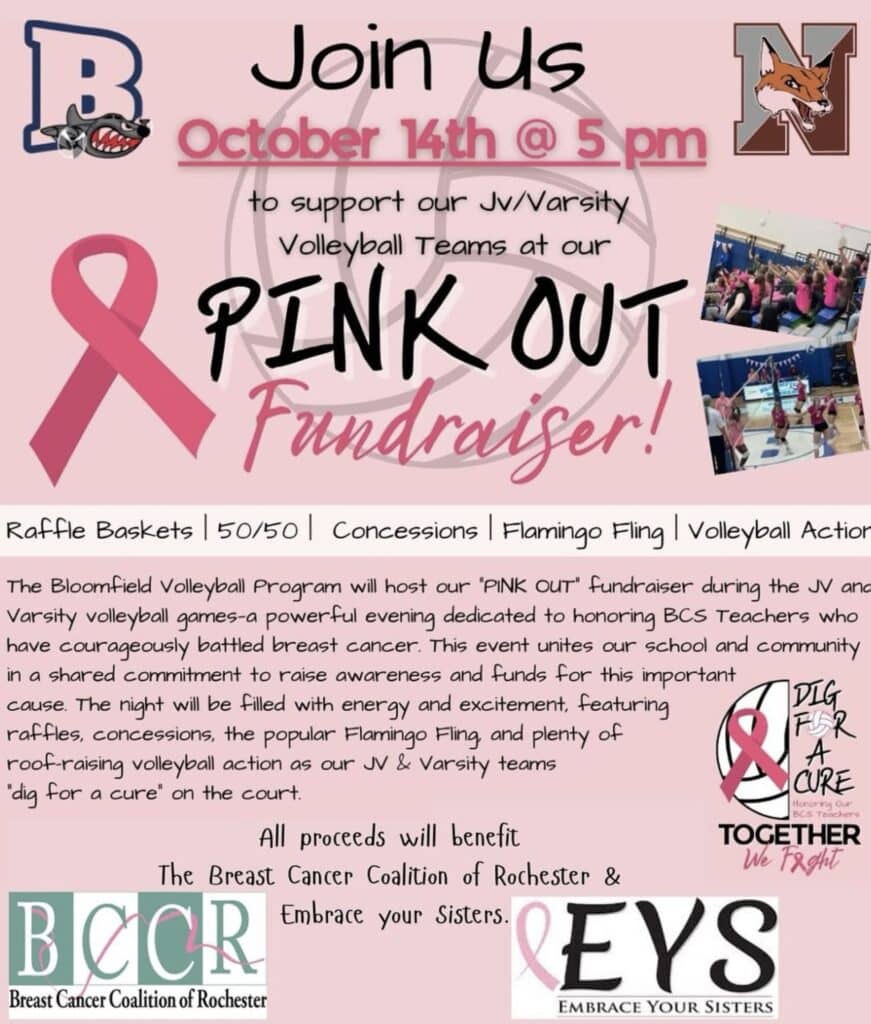 On October 14th, the Bloomfield Central School Volleyball Program came together to celebrate and honor their amazing BCS staff members who have bravely battled and beaten breast cancer. The JV and Varsity volleyball teams hosted a “Pink Out” fundraiser, creating a powerful evening dedicated to raising awareness and supporting this important cause.