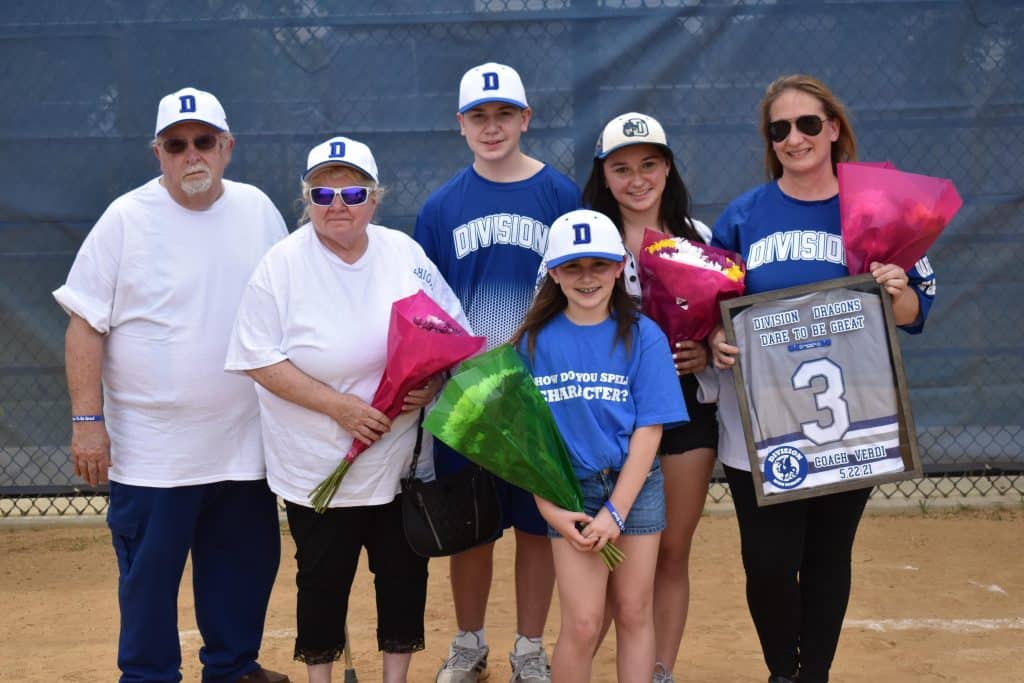 Captains Nicole Bowe and Vanesa Blanco presented a framed coach Verdi jersey to the Verdi family, and then it was revealed that, as of May 22, the number 3 will be retired in Verdi’s memory and will never be worn in Division Avenue softball again. The Verdi family was very thankful, and his daughter, Mikayla Verdi, eloquently expressed her gratitude.