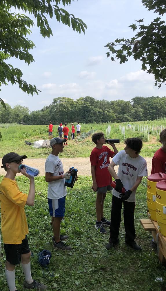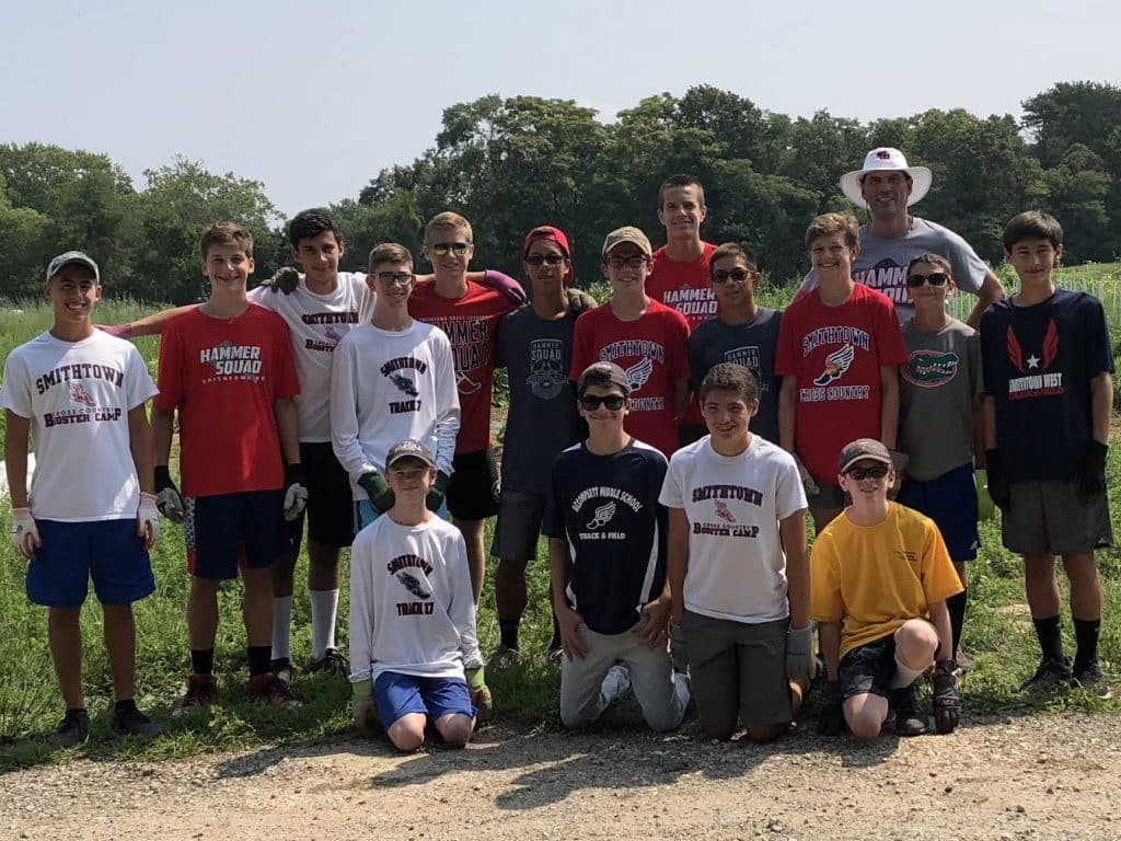 “After practice on Monday, August 27, members of the high school boys’ cross country team, led by Coaches Peter Schieck and Mark Jackett, headed down to the Island Harvest farm in Brentwood to volunteer for a couple of hours. Island Harvest is the largest hunger relief organization on Long Island, serving more than 300,000 Long Islanders annually, including adults, children, families, seniors, and veterans, through their network of approximately 570 food pantries, soup kitchens, and other emergency programs. The boys learned about Island Harvest from staff member Hillary Hess, and then pulled weeds in between the rows of vegetables, as well as harvesting some zucchini and eggplant. It was a hot day, but the boys learned a lot and had fun serving their fellow Long Islanders in need! Great job, boys!”