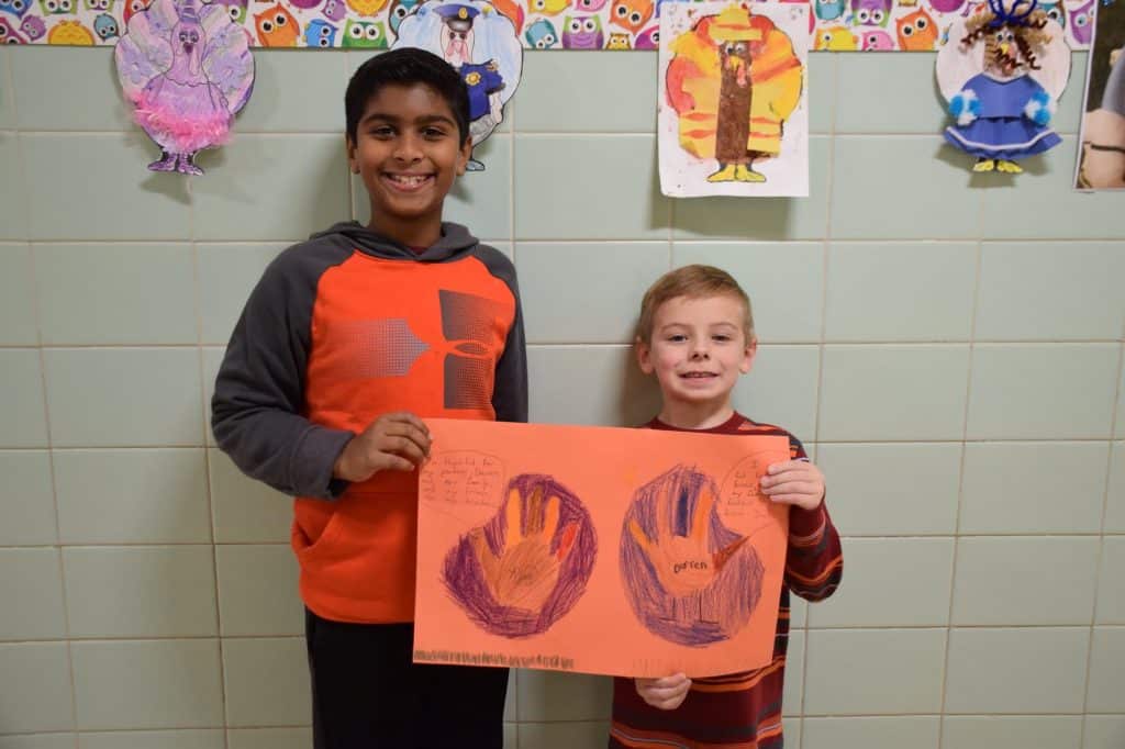 Fifth-graders from Mrs. Christine Shaw’s class partnered up with kindergartners from Mrs. Kathy Admunsen’s class to trace their hands to create a turkey and assisted them in penning what they were thankful for. These two classes come together on a regular basis and do different activities together. Each student has an assigned buddy that they spend time and build relationship with.