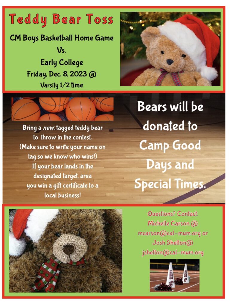 This represents a joint community service initiative undertaken by Cal-Mum Cheerleading and Boys Basketball. During the halftime of our upcoming game against Rochester Early College tomorrow night, spectators will participate by tossing teddy bears onto the court. Subsequently, these teddy bears will be gathered and offered as heartwarming gifts to Camp Good Days and Special Times. We understand that the holiday season can pose challenges for numerous families, so we aim to make a positive impact by bringing joy and smiles to those in need.
