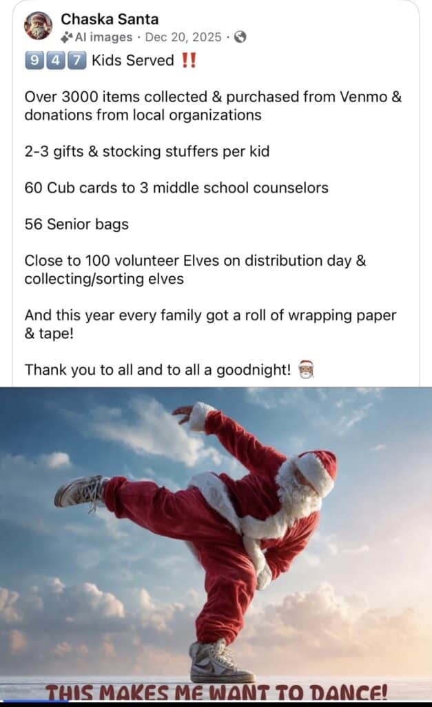 All toy donations were delivered to Chaska Santa, while monetary donations were sent directly through Chaska Santa’s Venmo account. While exact totals specific to the hockey game were not available, the collective effort contributed to a larger, community-wide impact driven by Chaska Santa throughout the season.