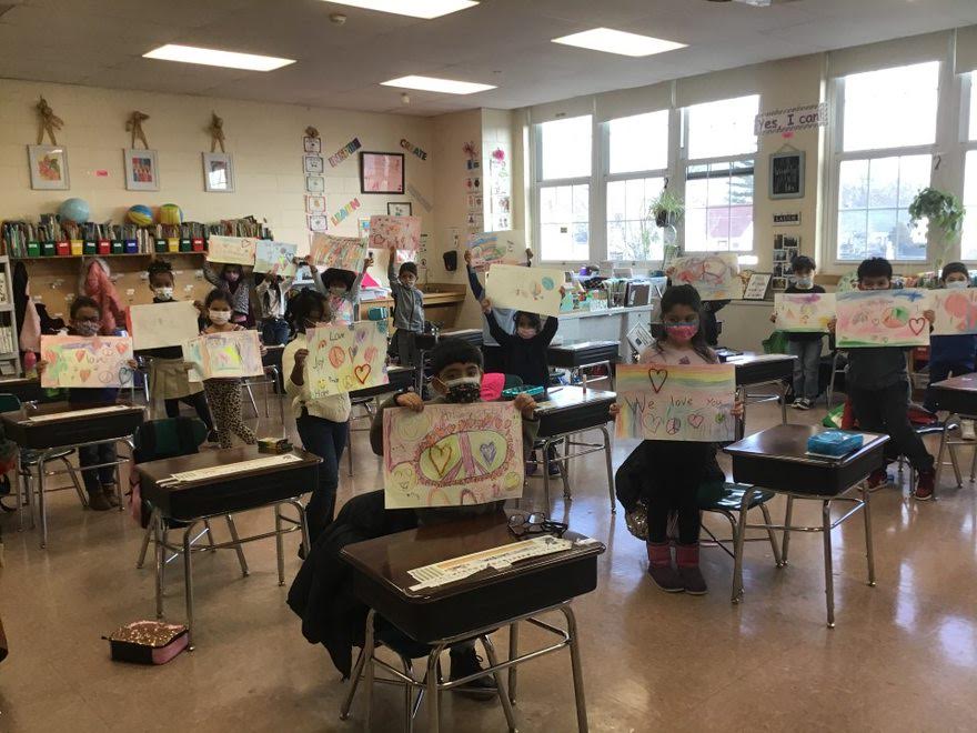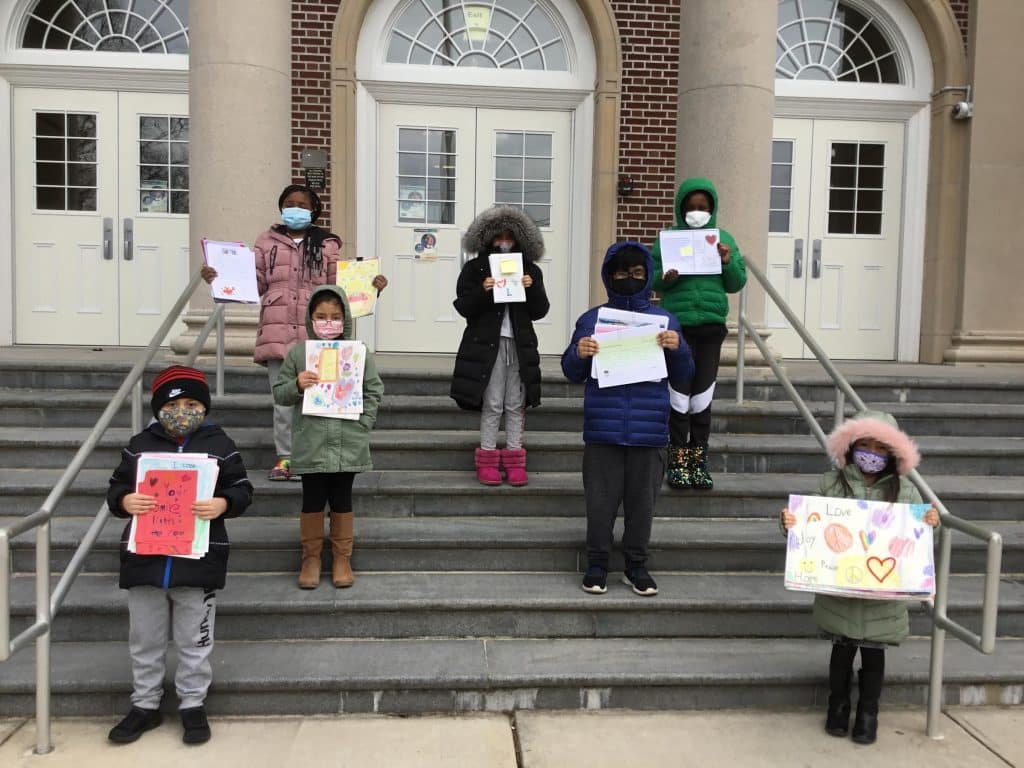A schoolwide community service project was the highlight of the virtual assembly. Younger students created “peace and love” cards and posters to decorate the room doors and walls of the elderly residents of the Plattduetsche Home Society in Franklin Square. Older students wrote and decorated thank-you letters to the staff members who risk their lives on the front lines caring for these residents. Images of the residents and staff receiving the students’ cards and letters were added to the end of the assembly.
