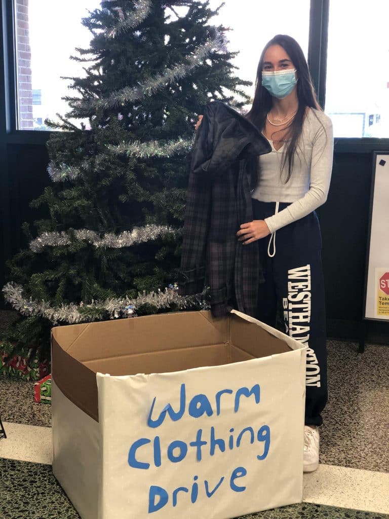 Photo caption: Westhampton Beach High School Key Club member Giavanna Spagnolo recently organized a successful clothing drive to help those in need at Maureen’s Haven in Riverhead. Thanks to the generosity of students, teachers and staff, the junior was able to collect several boxes full of new and gently used coats, scarves and gloves.
