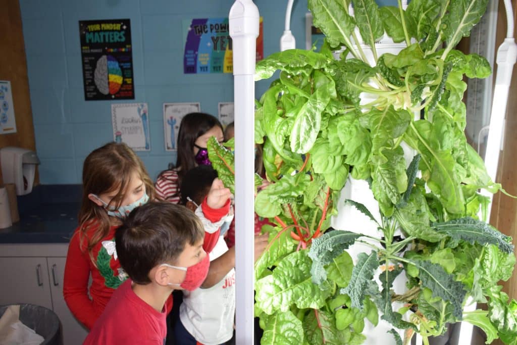 Photo B: Helen B. Duffield Elementary School students in Christina Tenaglia’s first grade class harvested fresh greens from their tower garden for the district’s food pantry.