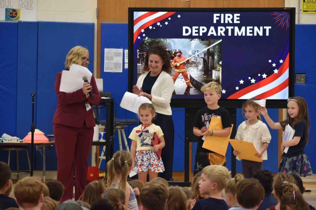 Photo C: Cutchogue East Elementary School students recognized local first responders and are pictured with, l-r, instructional coach Leah Vitucci and Principal Amy Brennan.