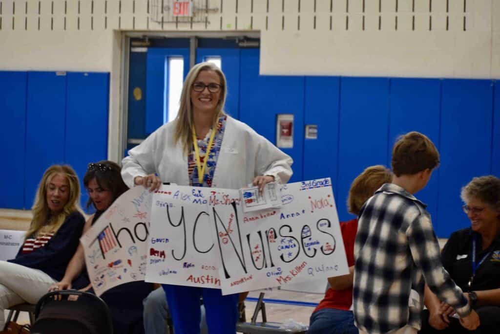 Photo D: Cutchogue East Elementary School nurse Susan Winters received a banner with signatures from appreciative students and staff.
