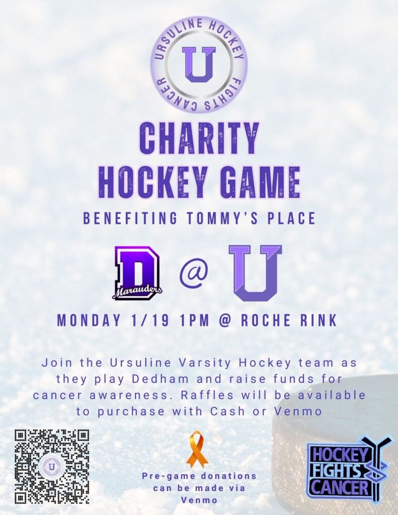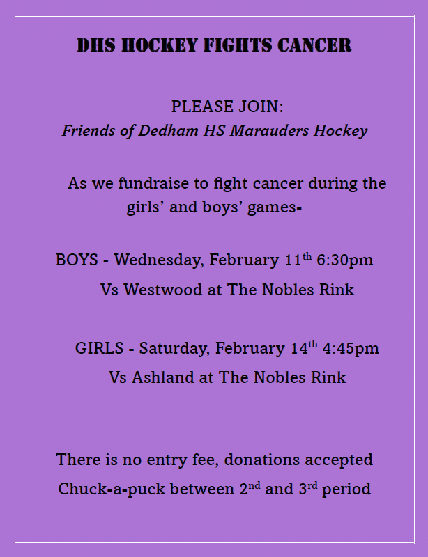 In addition to their mental health advocacy efforts, the Dedham hockey programs also participated in several “Hockey Fights Cancer” initiatives throughout the season. Special awareness games were organized to raise funds and provide support for families impacted by cancer, including a charity matchup benefiting Tommy’s Place, an organization that helps create memorable experiences for children facing cancer.
