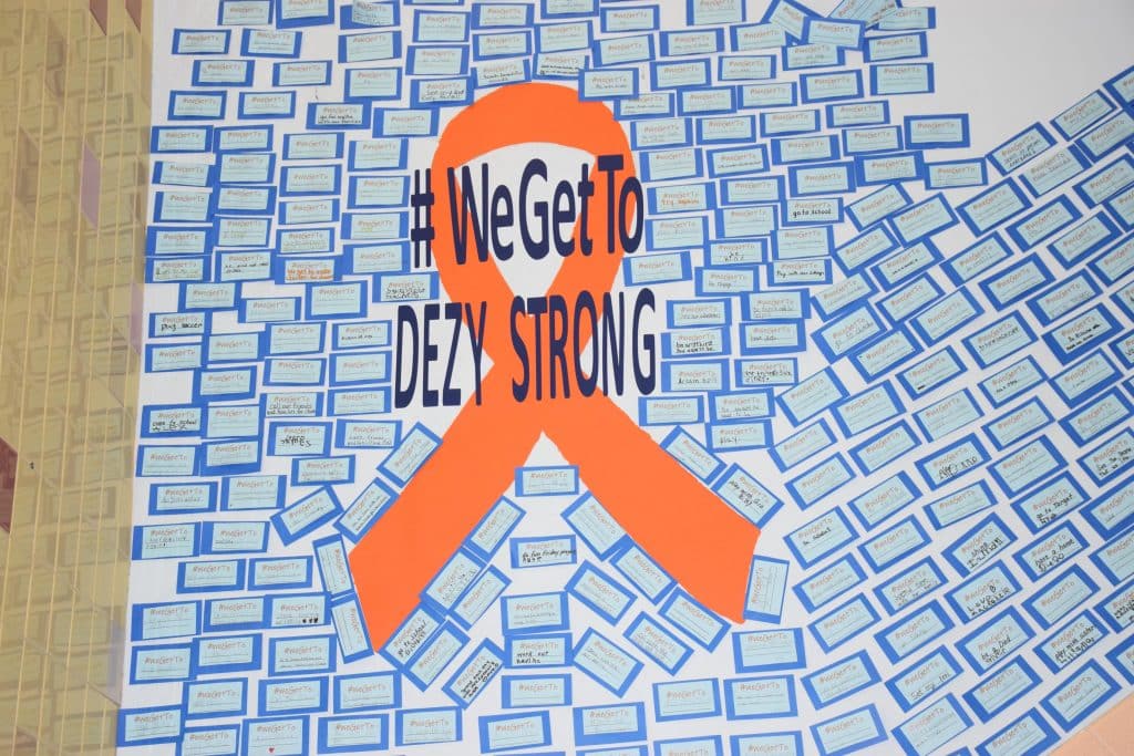 Each Thursday, students wore their Dezy Strong shirts, Mr. DiStefano’s former cancer treatment day, and decorated the lobby wall with ribbon pledges to demonstrate their own strength and their support of the annual fundraiser.