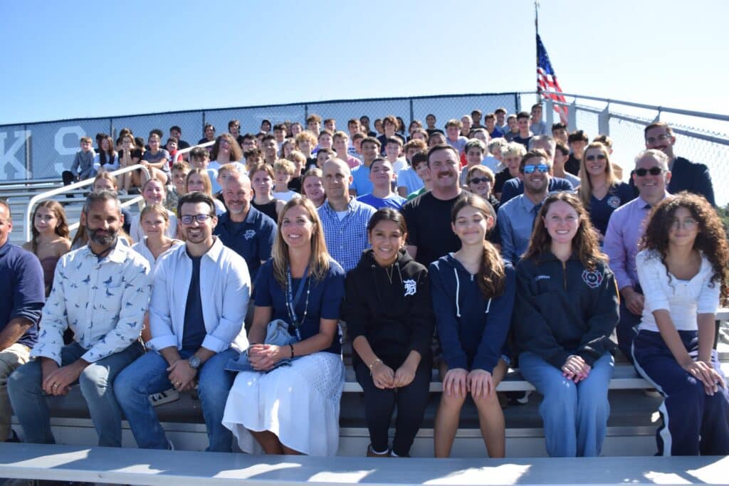 On Patriots Day, Eastport-South Manor Jr.-Sr. High School held a symbolic stair climb to honor Sept. 11 victims and first responders. Students, faculty and staff marched to the stadium bleachers, led by social studies teacher Thomas Hayes and K-12 social studies director Dr. Stephen Posselt, where they climbed 2,200 steps, representing 110 floors of the former World Trade Center building in New York City.