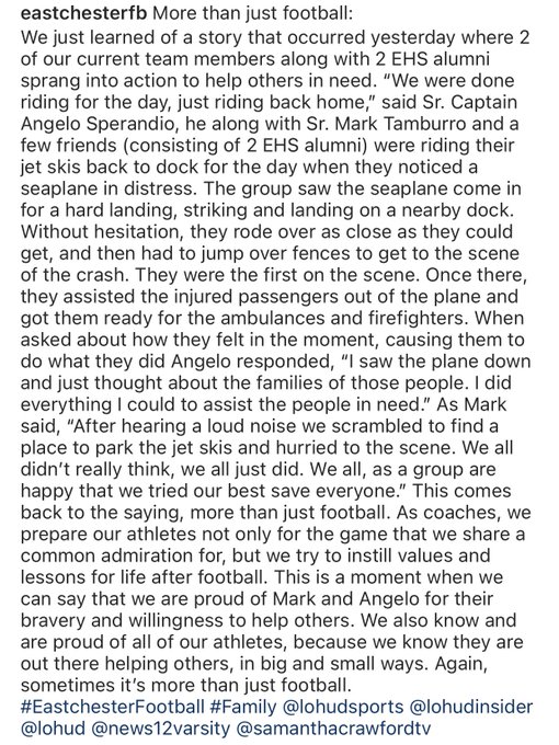A single-engine seaplane broke to pieces after it crashed on the top of a concrete pier in Queens around 3 p.m. Sunday, resulting in one death and two critical injuries, according to the New York City Fire Department. The two surviving occupants, including the pilot, were rescued by Sperandio, Tamburro and their friends….” https://www.lohud.com/story/news/local/new-york/2020/10/06/eastchester-football-players-rescue-seaplane-crash-victims/3636153001/
