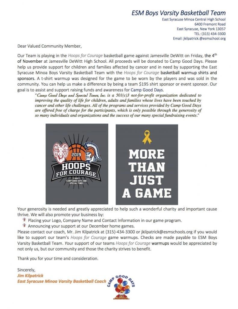 On friday at the boys basketball game between JD and ESM we will continue to raise awareness and Funds for Camp Good Days. The campers will cheer with the cheerleaders and sit on the bench with the players. We will have the campers announced at the start of the game with the starting line ups.