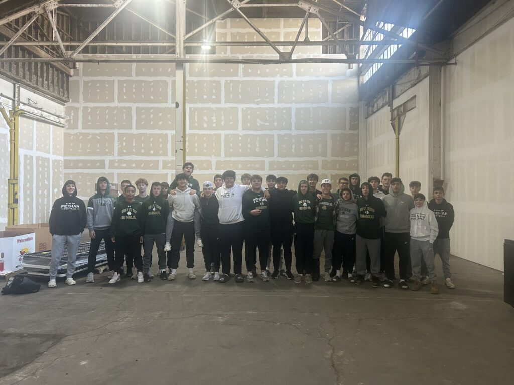 On Veterans Day morning, Bishop Feehan’s Freshman Football team chose to honor the meaning of the day through action. Instead of sleeping in or relaxing, 32 freshman players gathered at FeedRI to volunteer their time and energy — and their commitment made a powerful impact.