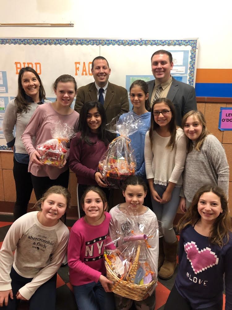 Photo caption: Munsey Park School Kindness Club members are pictured displaying the Code Lavender baskets they created and donated with Principal Chad Altman (back row, center), Assistant Principal Brian Nolan (back, right) and Jennifer Lippmann, a physician’s assistant (back, left) who delivered the baskets.