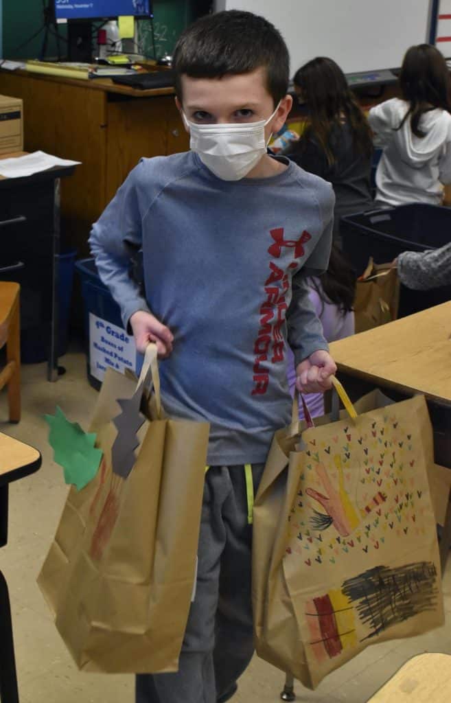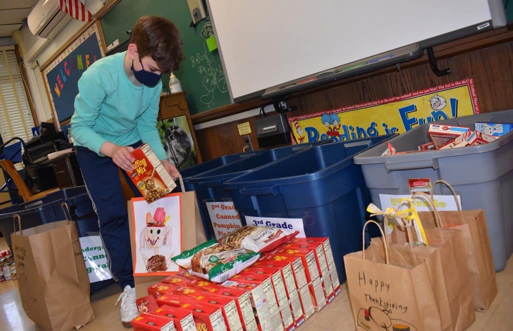 Large bins were placed in the lobby during the week of Nov. 16-20, and each grade was assigned different items to bring in to ensure that everyone would receive all the necessary components of a Thanksgiving meal. After school, Kindness Club members filled large paper bags with canned fruits and vegetables, cranberry sauce, gravy, mashed potatoes, pie filling, stuffing and more.