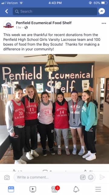 The Girls Lacrosse team and the Penfield food shelf recently worked together. the food shelf collects and distributes food to families throughout the year.