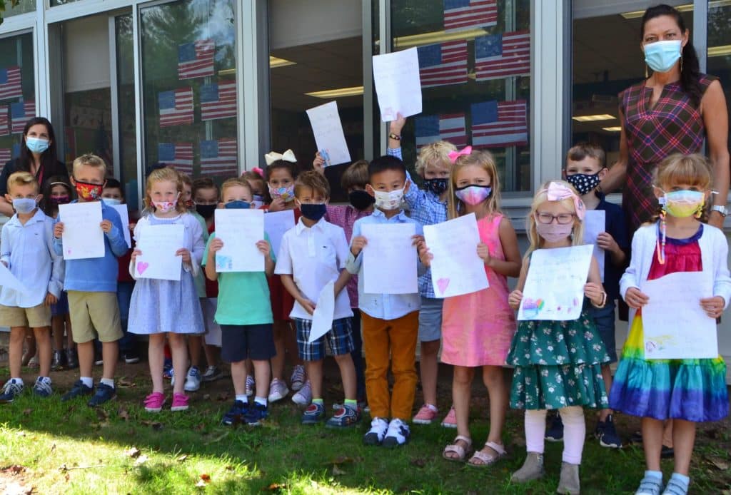 Hemlock students heard the story Fireboat by Maira Kalman and learned about ways that people can help the world. Some classes wrote thank you notes and drew pictures to give to helpers, and all students created their own patriotic pinwheels that they proudly displayed outside. Students from Homestead and Locust schools wrote powerful messages of thanks to the Garden City Police Department, the Garden City Fire Department, health care workers at Winthrop Hospital, Veterans and nurses. Homestead classes also created paper American Flags that were displayed on classroom windows, and Locust students and staff members wore red as a symbol of appreciation for those who keep them safe.