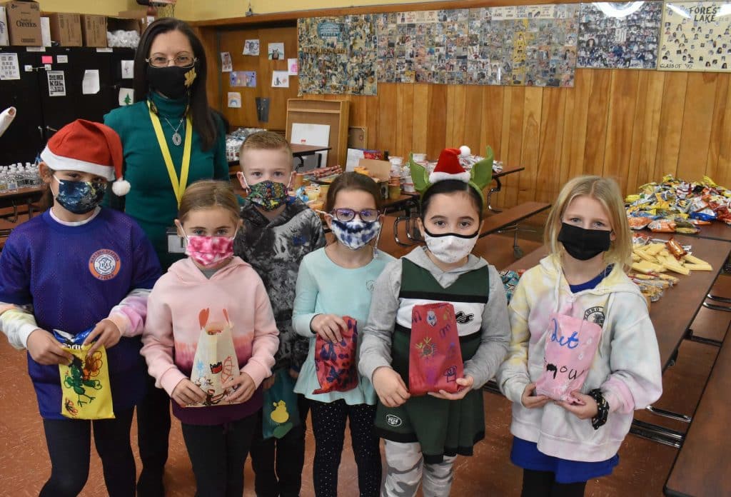 1: Forest Lake Elementary School Principal Jessica Zimmer was joined by students who helped fill snack bags on Dec. 20 to be donated to the Interfaith Nutrition Network.