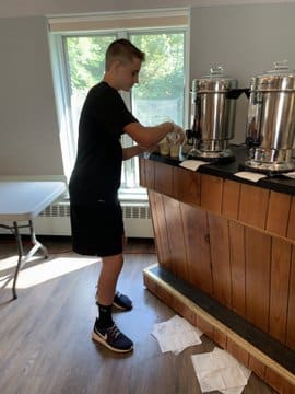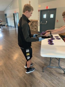 We help setup the church and food for the meal. The boys helped seat the guest and got them drinks. Then the boys helped serve the meal. We also helped with the cleanup process