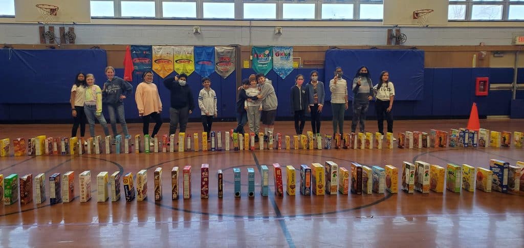 - Old Country Road School fifth grade student council coordinated a community giving effort to support local food pantries with a giant cereal box domino run.