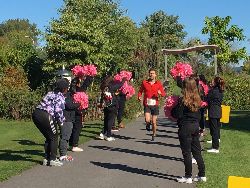 IHS Cheer Team up and at it Saturday morning, supporting Cancer Resource walkers and runners!
