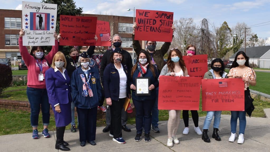 After classes on April 14, the clubs walked to the U.S. Vietnam Veterans Memorial on Main Street, where they met veterans and presented them with the collected donations. Joining the students were Town of Islip Supervisor Angie Carpenter, American Legion Auxiliary President Paulette DeCrescenzo; American Legion Vice President Joanne Johnson and Islip High School teacher Renee Clock.