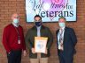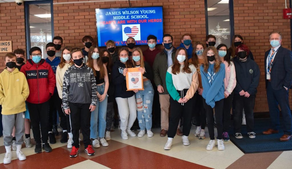 A: New York State Assemblyman Jarrett Gandolfo, center, is pictured with James Wilson Young Middle School students who participated in the Valentines for Veterans program and, right, Principal John Andruszkiewicz.
